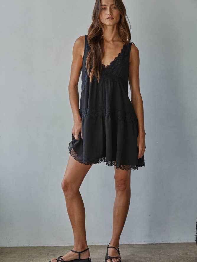 This Lace Detail V-Neck Sleeveless Mini Dress in black combines elegant design with a flattering silhouette, making it a versatile choice for various occasions. Crafted with intricate lace detailing, it offers a timeless and refined style.