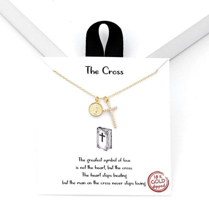 Elevate your style with 'The Cross' dainty chain link necklace, adorned with a stunning cubic zirconia cross and praying hands pendants. Crafted from gold-dipped, hypoallergenic brass, this piece, approximately 16" in length with a 2" extender, is made in Korea and is lead and nickel-free. Embrace the greatest symbol of love with this exquisite necklace.
