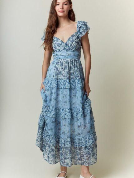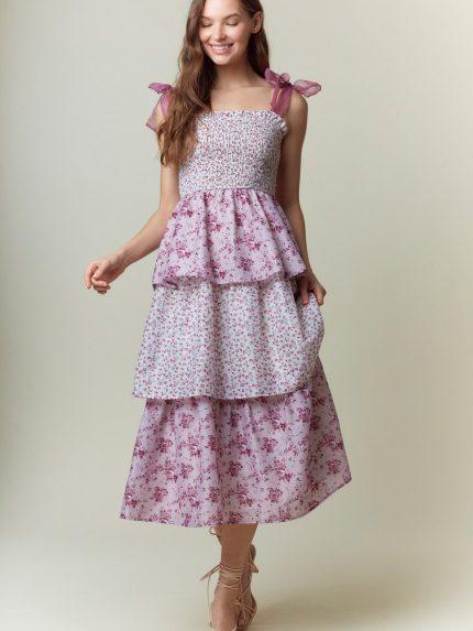 Organza Strap & Smocking Detailed Floral Printed Sleeveless 3 Layer Ruffle Maxi Dress
