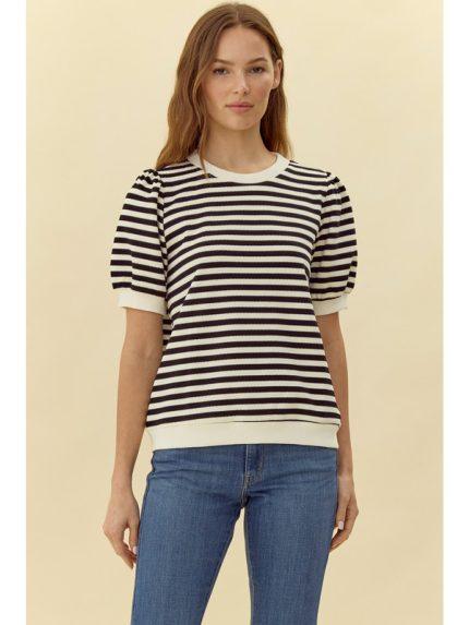 Striped Top with U-Neck, Short Puffed Sleeves and Ribbed Hems